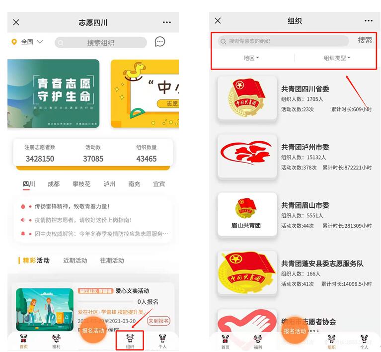 进入“志愿四川”平台成人色情,点击下方组织,按照标准筛选或自己输入,找到组织。
