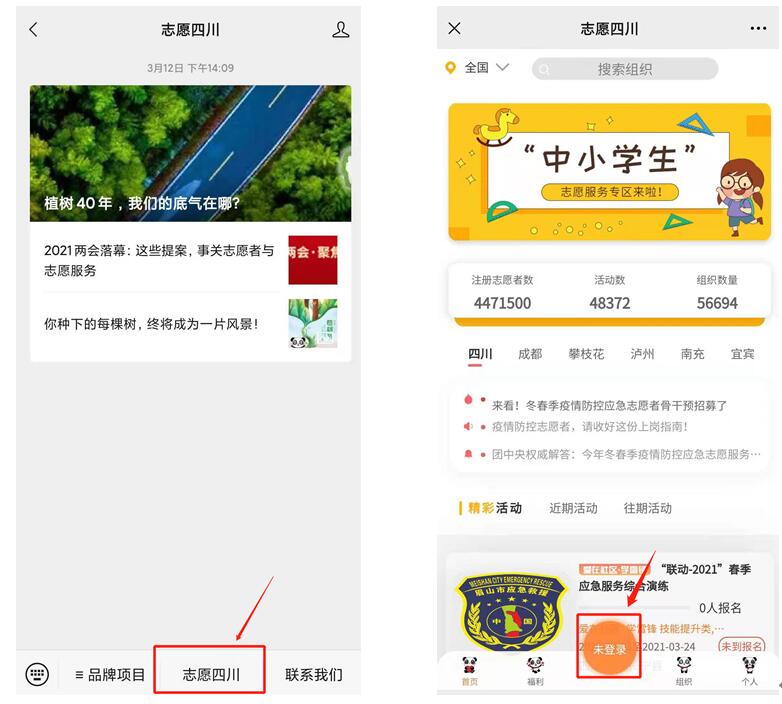 第二步:进入“天府新青年”或“志愿四川”公众号,点击左下方“志愿四川”进入平台成人色情,点击下方“未登录”按钮。