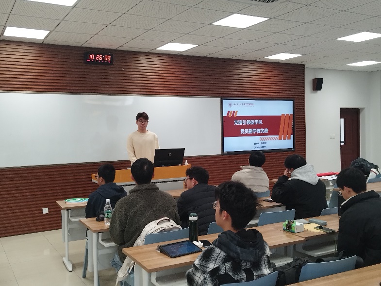 为扎实推进学风建设,涵养优良校风学风,传承发扬“严谨治学,严格要求”优良传统,充分发挥党员先锋模范作用,党支部邀请学生党员发展服务中心主任孙浩宇围绕“党建引领促学风,党员勤学做先锋”分享期末备考、竞赛转化经验。