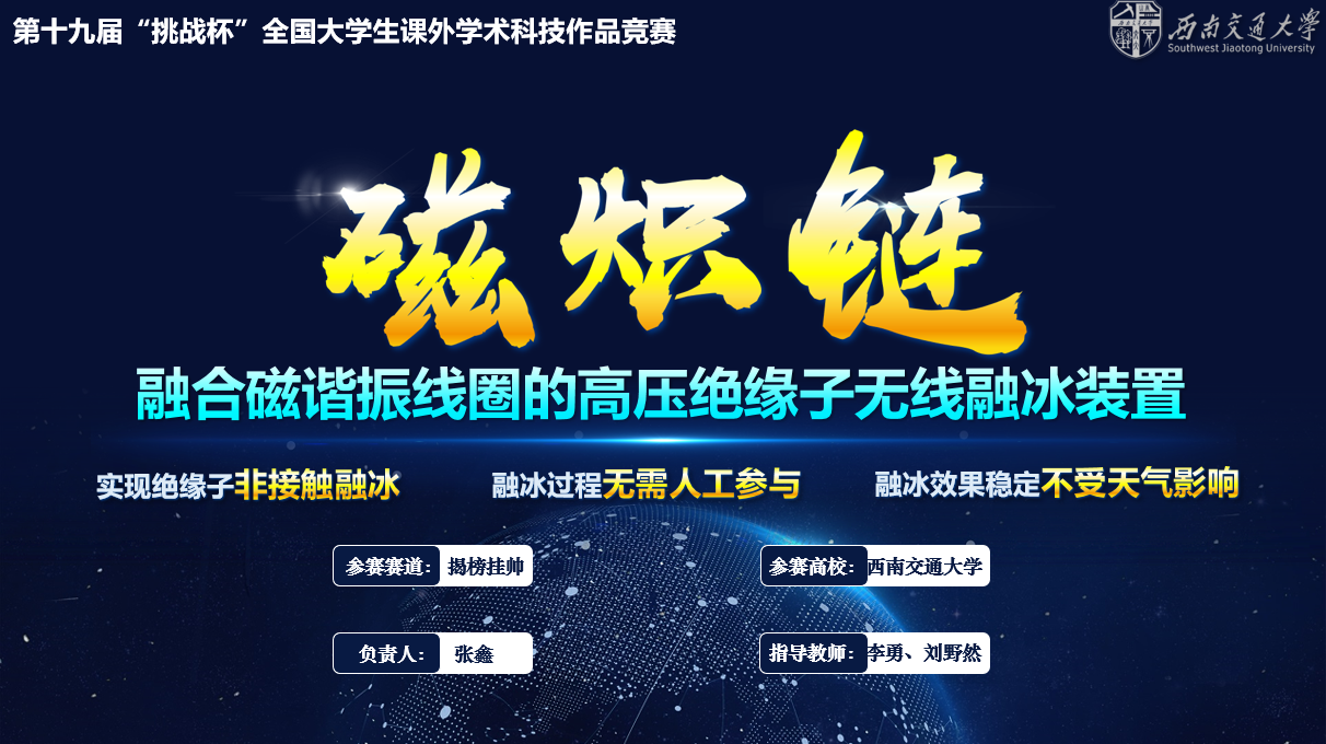 10月14日,2025年度中国青年科技创新“揭榜挂帅”擂台赛“新能源领域”终审主擂台赛在北京昌平圆满落幕。在校团委的指导下,成人色情 李勇老师指导的作品“磁炽链-融合磁谐振线圈的高压绝缘子无线融冰装置”,在全国众多参赛项目中脱颖而出,代表学校成功斩获学生赛道特等奖,这是学校在“挑战杯”这一全国顶级科创赛事的“揭榜挂帅”赛道上,首次斩获特等奖,实现了这项荣誉的“零突破”,以硬核科创实力诠释“青春为中国式现代化挺膺担当”的赛事主题。